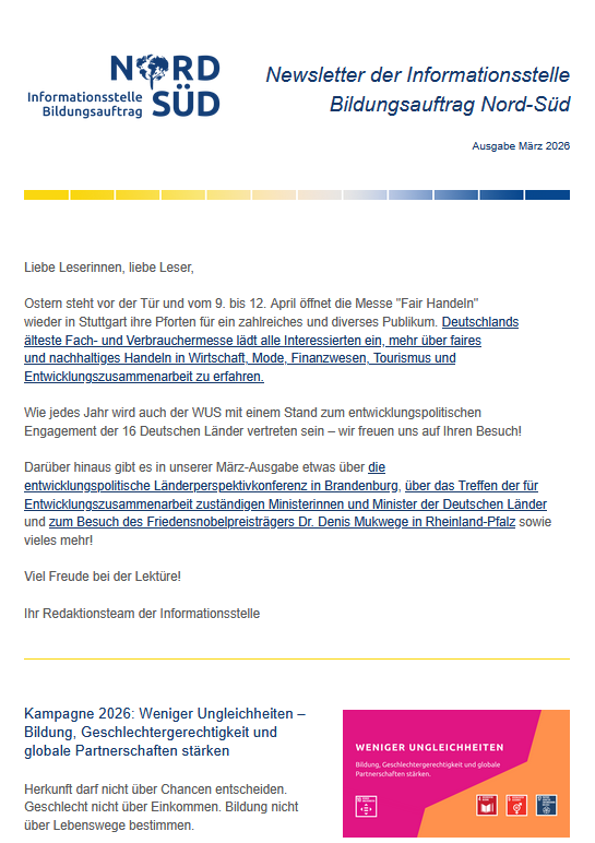 Darüber hinaus gibt es in unserer März-Ausgabe etwas über die entwicklungspolitische Länderperspektivkonferenz in Brandenburg, über das Treffen der für Entwicklungszusammenarbeit zuständigen Ministerinnen und Minister der Deutschen Länder und zum Besuch des Friedensnobelpreisträgers Dr. Denis Mukwege in Rheinland-Pfalz sowie vieles mehr!