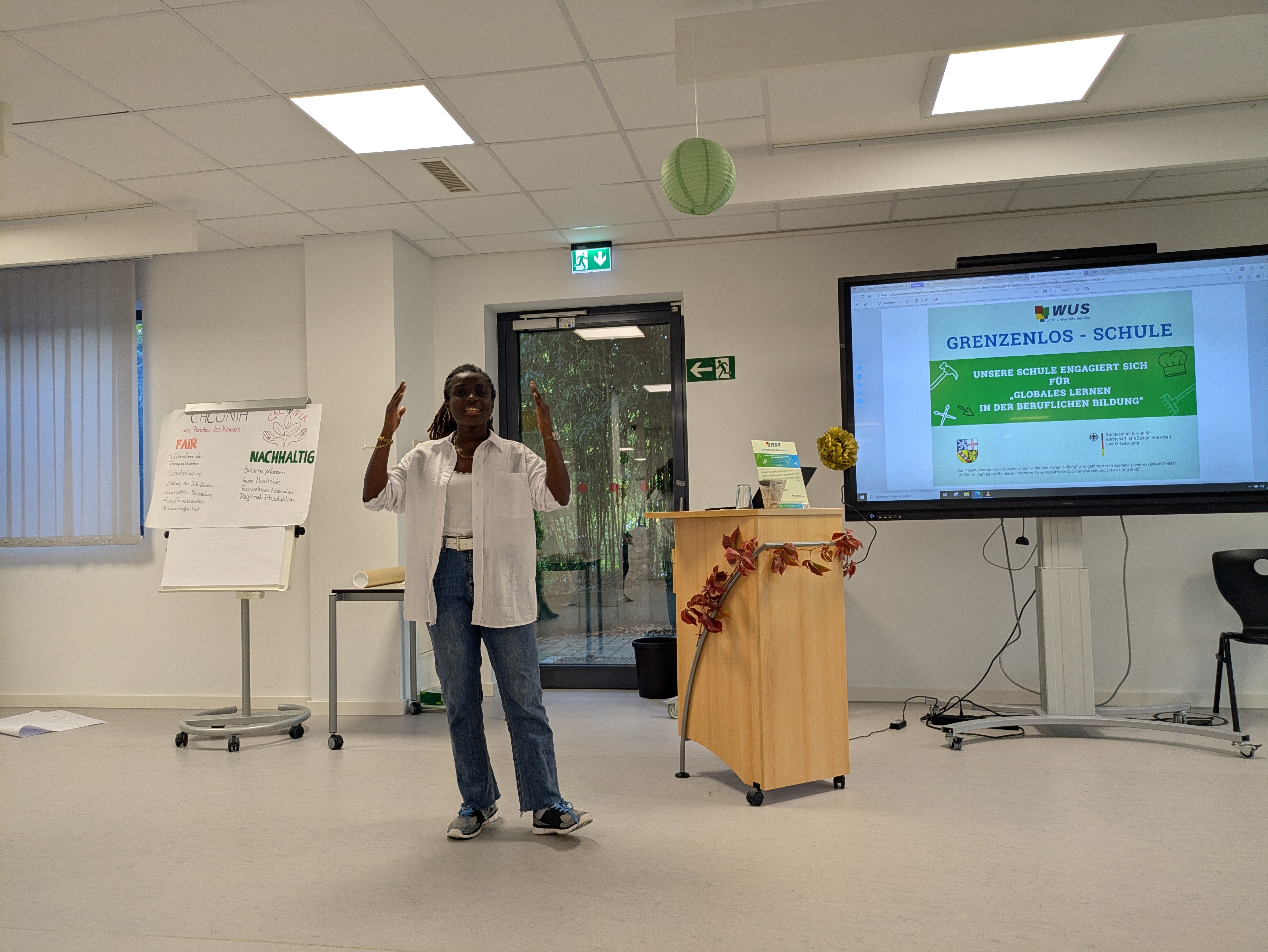 Abschließend präsentierten die Grenzenlos-Aktiven Mafouais Roxane Kouassi und Ebrottié Vincent N´ZO aus der Côte d’Ivoire gemeinsam mit den Schülerinnen und Schülern der BSZG Erlangen und Lehrerin Daniela Graef die Ergebnisse ihrer Lehrkooperationen.