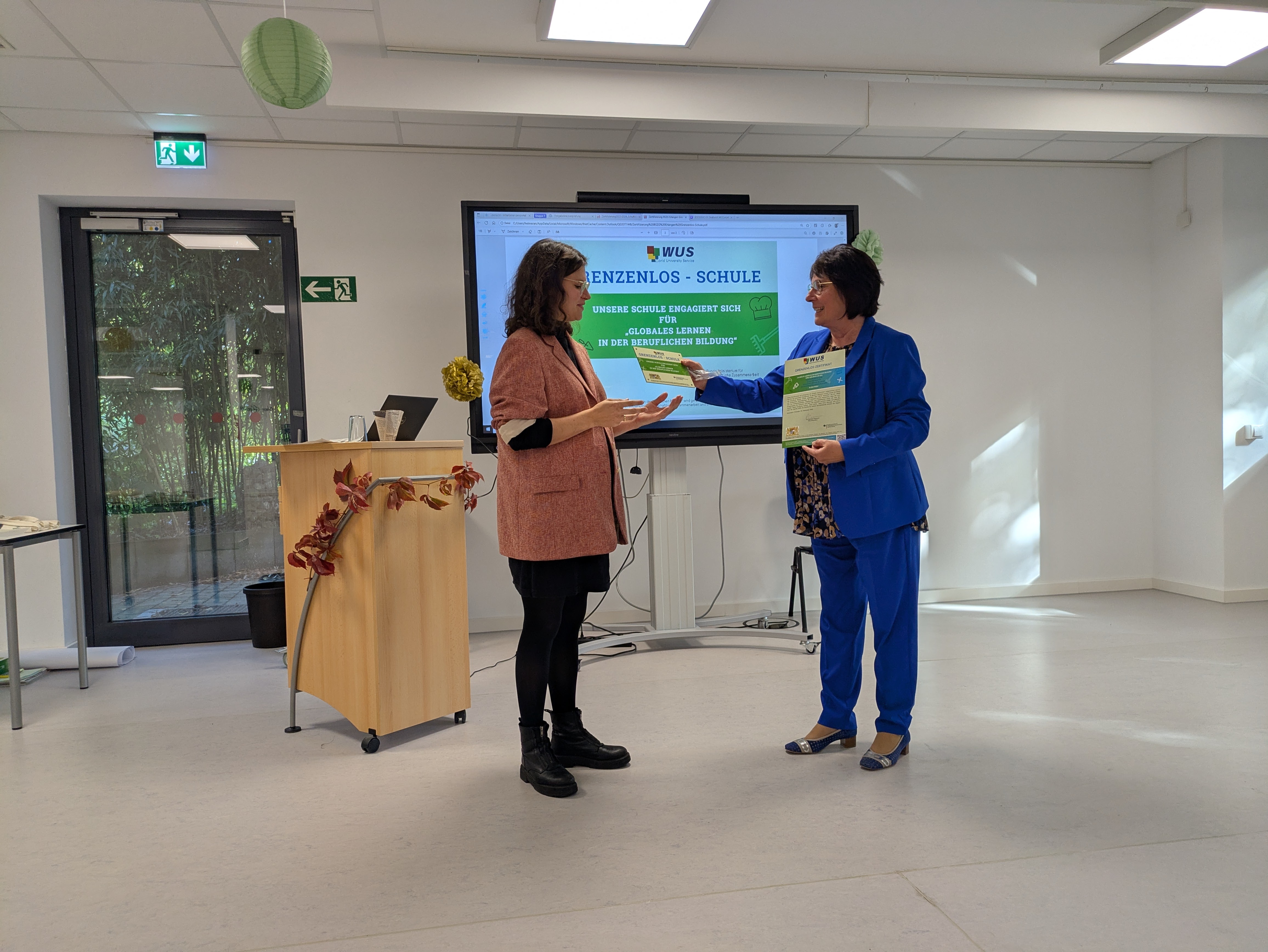 Die Schulleiterin Susanne Krapp, welche die Gäste am BSZG Erlangen begrüßte, beschrieb die Auszeichnung als Grenzenlos-Schule durch die Bedeutung der Lehrkooperationen: „Das Wissen erhalten wir zum Beispiel durch Lehrkooperationen mit Grenzenlos, wo wir schon einige in der Schule hatten durch das Engagement von Frau Graef durften wir das schon hier erleben. Dann durch Besuche und Darstellungen von Studierenden, die auch heute wieder geschehen, wo wir sehr froh sind, wo wir auch merken welche Auswirkungen unser Tun hat, auch am anderen Ende der Welt.“