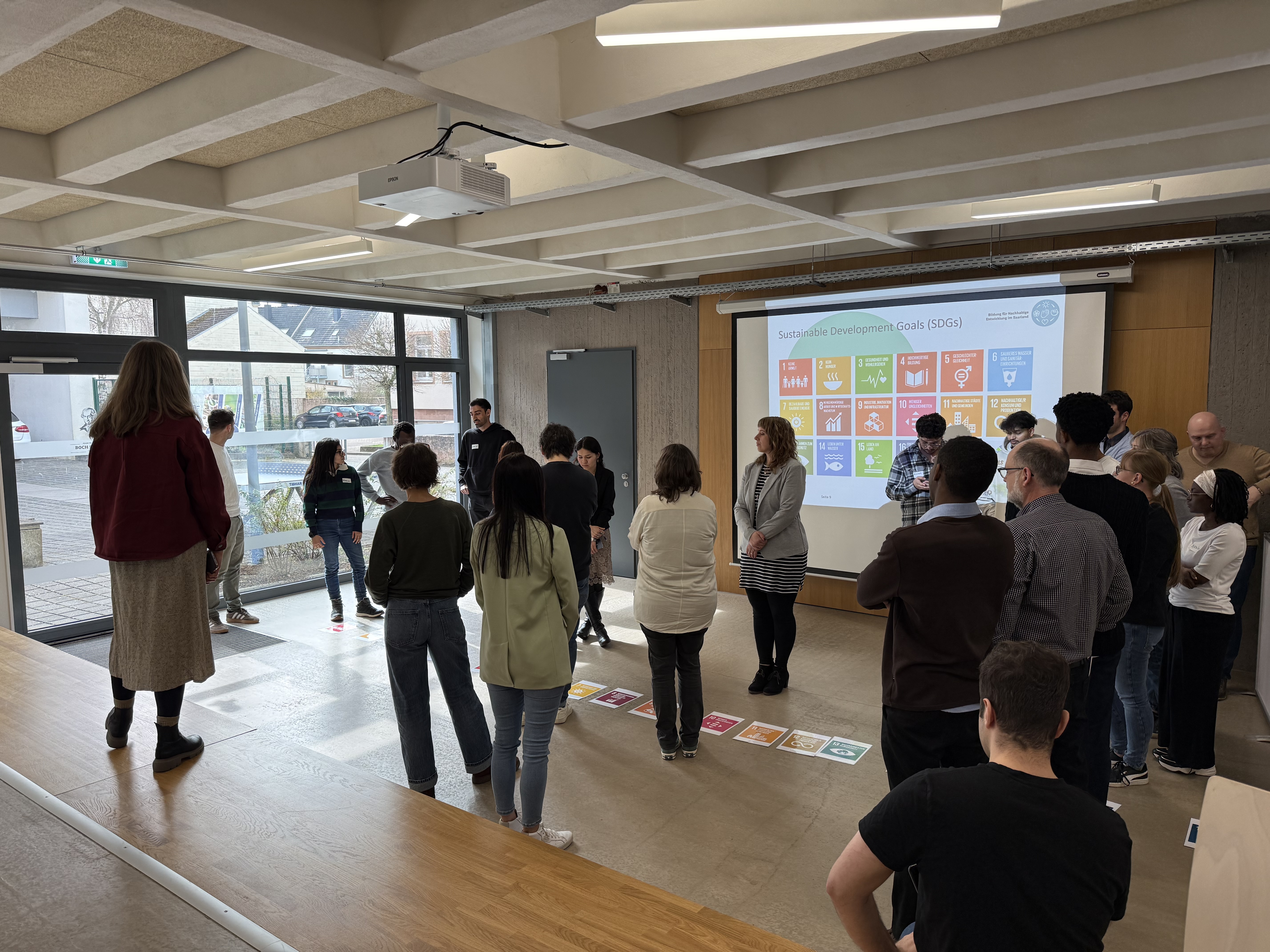 Dr. Daniela Schmitz, saarländische Landeskoordinatorin für Bildung für Nachhaltige Entwicklung des Ministeriums für Bildung und Kultur, verdeutlichte in einem kurzweiligen Impuls prägnant die Anwendbarkeit einer BNE für die berufliche Bildung sowie normative Grundlagen auf nationaler Ebene für die Umsetzung. Die in ihrem Impuls vorgestellten Kernbotschaften der Agenda 2030 wurden im Anschluss in einer interaktiven Übung gemeinsam diskutiert: Dabei wurde nicht nur die Relevanz der Sustainable Development Goals deutlich, sondern auch wie unterschiedlich die Perspektiven auf diese sind. Dass es zur Erreichung der 17 SDGs auf genau diese Perspektivenvielfalt ankommt, wurde vor allem beim Programmpunkt „Themenkosmos“ sichtbar: Die 13 Studierende aus 9 Nationen Afrikas, Asiens und Lateinamerika präsentierten dort ihre Themen. Diese reichten von „SDG #2, 12: Lebensmittelverschwendung und nachhaltige Ernährung“ über „SDG#8: Nachhaltige Finanzen“ oder „SDG#10: Afrika ist kein Land: zwischen Realität und Stereotypen" bis hin zu „SDG16#: Cybersicherheit und Technologien“, um nur einige aufzuzählen.