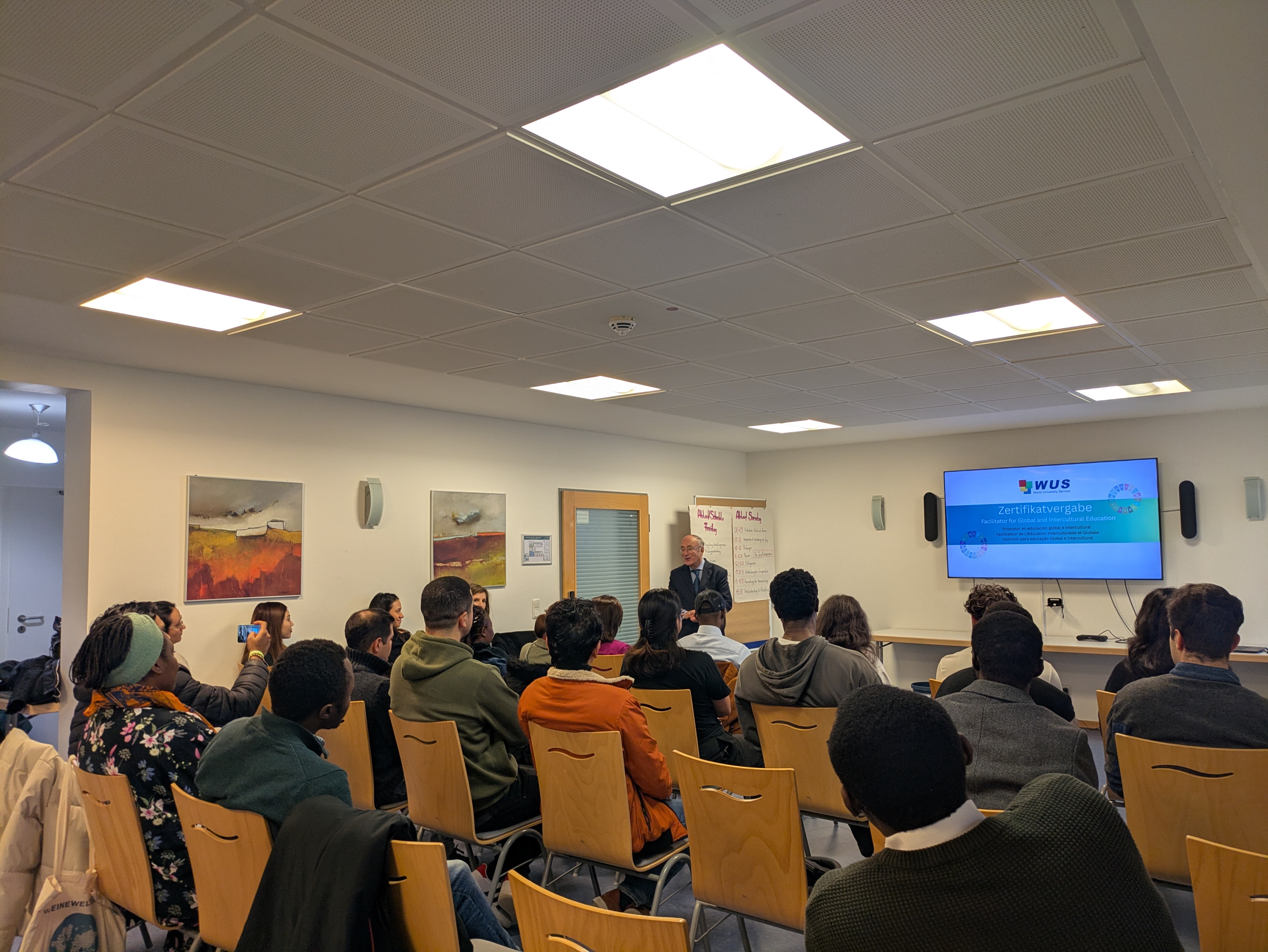 Wiesbaden 13.11.2025: Im Rahmen des zweitägigen Qualifikationsseminars II kamen 21 internationale Studierende aus verschiedenen Ländern Afrikas, Asiens und Lateinamerikas in Wiesbaden zusammen, um ihre Lehrkonzepte vor einer Fachjury zu präsentieren. Die Teilnehmenden zeigten eindrucksvoll, wie globale Themen wie Klimagerechtigkeit, nachhaltiger Konsum oder soziale Verantwortung praxisnah in den Unterricht an berufsbildenden Schulen eingebunden werden können. Dabei spiegelten ihre Präsentationen nicht nur fachliche Kompetenz wider, sondern auch großes persönliches Engagement und den Wunsch, junge Menschen in Deutschland für weltweite Zusammenhänge zu sensibilisieren. In seiner anschließenden Rede würdigte Dr. Kambiz Ghawami, Geschäftsführender Vorsitzender des WUS, dieses Engagement der Teilnehmenden. Er erinnerte insbesondere vor dem Hintergrund globaler Kürzungen von Entwicklungsleistungen und nationalen Eigeninteressen, dass „Solidarität […] kein Schimpfwort“ sei und ermutigte die Studierenden sich aktiv für die 17 Nachhaltigkeitsziele der Vereinten Nationen (Sustainable Development Goals, SDGs) einzusetzen.